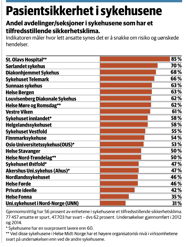 Helsedirektoratet la nylig frem en rapport om pasientsikkerhet som viser store forskjeller mellom sykehusene. Sykehuset i Tromsø kommer dårligst ut, noe som samsvarer godt med de mange uttalelser fra ansatte og tillitsvalgte ved sykehuset.